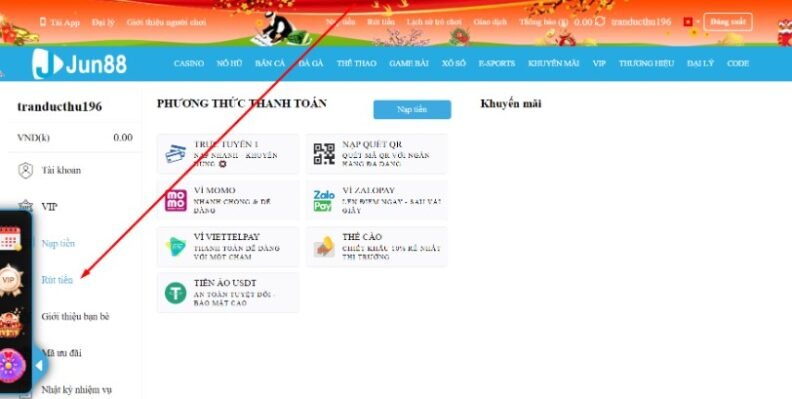 Jun88 nổi bật với hệ thống nạp – rút tiền nhanh chóng và an toàn. Nhà cái cung cấp đa dạng phương thức giao dịch, bao gồm: