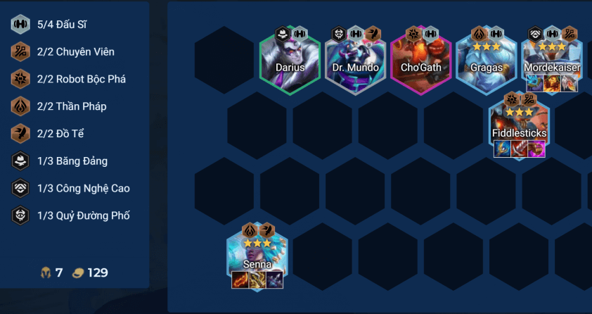 - Reroll Gragas, Mordekaiser, Fiddlesticks và Senna lên 3 sao ở cấp 7