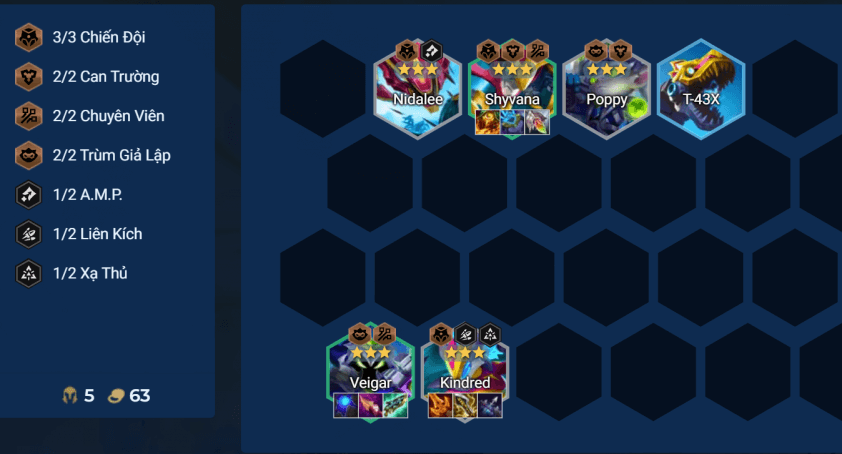 - Khi có nhiều Veigar và Chiến Đội, không nhà nào tranh, giữ ở cấp 5 và reroll Nidalee, Kindred 3 sao.